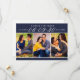 Estes casamento moderno e na moda salvam os cartões de anúncio de data incluem três fotos de noivado de 2 x 3" com a data apresentada no escrevendo elegante de roteiro. Personalize o texto da modelo da placa na frente e na parte traseira da placa para o seu grande dia. O fundo azul escuro / azul-meia-noite e a cor do texto podem ser personalizados para se coordenar com o seu esquema de cor do casamento.