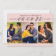 Estes casamento moderno e na moda salvam os cartões de anúncio de data incluem três fotos de noivado de 2 x 3" com a data apresentada no escrevendo elegante de roteiro. Personalize o texto da modelo da placa na frente e na parte traseira da placa para o seu grande dia. O fundo rosa claro e cor de texto preto pode ser personalizado para coordenar com o seu esquema de cor do casamento.