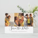 Esta foto moderna de script salve o cartão de data com suas três fotos especiais, sobrepostas com um roteiro elegante, salve a data acima de seus nomes, data e local na tipografia branca. O inverso tem os detalhes adicionais da data, incluindo o site do casamento, com seu endereço de retorno e espaço para o endereço do destinatário. Projetado por Thisnotme©