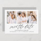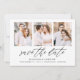 Anuncie seus próximos nupciais em estilo com nossa foto do Elegant Script para salvar o cartão de data. Os cartões salve a data elegantes exibem 3 de suas fotos de noivado favoritas, enquadradas em branco com "salvar a data" em um roteiro de caligrafia preto e moderno. Personalize o cartão adicionando seus nomes, data do casamento e local do casamento. O minimalista salve a placa de data reverte para um fundo de cinza sólido ou uma cor de sua escolha.