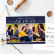 Um sofisticado e impressionante save the date com uma faixa azul-marinho profunda com numerais e nomes em branco nítido, acima de uma colagem de três fotos que mostram suas fotos de noivado favoritas. A paleta rica e sombria cria uma estética elegante e formal perfeita para estilos de casamento de inverno, náutico ou black-tie. O painel traseiro coordenador inclui espaço para detalhes do casamento e seu site. Todo o texto e fotos são totalmente personalizáveis.