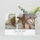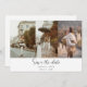 Uma bela colagem de fotos elegante e romântica para anunciar sua data de casamento. O design é na moda e elegante. Ele apresenta três fotos personalizadas colocadas próximas umas das outras e o texto abaixo na caligrafia moderna em fundo branco. Pressione o botão de personalização para substituir a imagem em destaque por suas fotos e o texto por suas informações de casamento. Visite nossa loja para mais produtos, selos e coleções