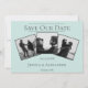 Anuncie a data do seu casamento para amigos e familiares com este moderno Colagem de 3 Fotos Salve o Dia. O design do anúncio apresenta três espaços para fotos do casal feliz, design de texto limpo e um padrão de diamante elegante no verso.