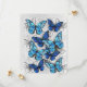 Composição vertical de borboletas de morfo realistas, azuis e brancas sobre fundo texturizado de cinzas. Borboleta azul Morpho.
