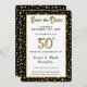 Salve a data para celebrar um aniversário de casamento de 50 anos. Que conquista! Tão digno de confetes. Veja nosso chuveiro de confetes de ouro falso em um fundo preto por trás de uma caixa de texto branca bordeada em ouro falso. Imagens de texto Salve a Data e 50º em cor dourada são como 3D para um efeito WOW. No geral, um anúncio de Salve a Data muito elegante e simples para o seu grande evento próximo.