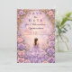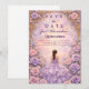 Este elegante design de quinceañera apresenta um fundo de aquarela lavanda sonhador emoldurado por rosas exuberantes e detalhes dourados ornamentados, com uma ilustração de vestido graciosa criando uma atmosfera suave de conto de fadas. A paleta roxa pastel, flores românticas e composição refinada dão ao design um sentimento luxuoso, mas jovem, perfeito para uma celebração clássica de quinceañera com uma estética encantada e elegante.