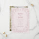 Cor-De-Rosa Esmagada Salve A Data. Romântico e eterno, este casamento rosa escamoteado, salve o cartão de data, que mostra os peões florais de vintage line art, organizados como um belo quadro que pode ser usado em qualquer época de casamento. Adicione um toque de elegância moderna e clássica ao seu dia especial com este na moda e belo anúncio de casamento. Texto Rosa empoeirado sobre fundo rosa pálido com uma foto noivado no verso.