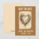 Este lindo cartão de Save the Date apresenta uma ilustração de uma grinalda em forma de coração feita de videiras, flores e um coração. Acima dela, está escrito "Save the Date" e abaixo estão os nomes e a data do evento. O texto é editável, então vá em frente e altere os detalhes, bem como o estilo, cor e tamanho da fonte. As cores do fundo em ambos os lados do cartão também podem ser alteradas.