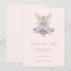 Cartão de salvar a data com uma imagem elegante de um ser celestial de anjo fada. Com asas e vestido coloridos em tons pastéis rosa e azul. Flores no cabelo. Estilo mágico e sofisticado.