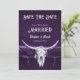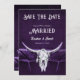 Este casamento roxo e roxo, roxo e torto, de oeste, personalizado 5x7 Salve o modelo da placa lisa de Data apresenta um crânio de vaca rodeio com um fundo design de textura country. Design de animais legal, de moda, ao estilo vintage, ao estilo ocidental selvagem antigo. Imagem copyright Marg Seregelyi Fotografia.