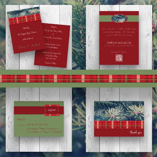 Casamentos de dezembro trazem lindos quadros coloridos, especialmente verde-forte e crimson. Você tem a oportunidade de incorporar cores e temas de Natal em seu papel de papelaria e roupa. Este cartão com fotos Salvar a Data exibe uma imagem de ramificações evergreen na parte superior e sólida na parte inferior. Ele é dividido por uma fita feita de xadrez vermelha e verde.