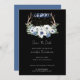 Este convite de casamento Boho apresenta fases de crista e lua de cheio com flores brancas e azuis, pontos de aglomerado de cristal de ouro, verde de inverno e galhadas. Uma escolha perfeita para uma união espiritual mística ou metafísica, para um aperto de mão ou para um casamento no inverno. As cores e fontes de fundo podem ser facilmente alteradas para corresponder às suas necessidades.