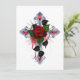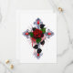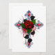 Cruzamento prateado com rosa vermelha e folhas pretas sobre fundo branco.