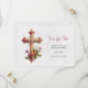 Guardar o cartão com uma ilustração bonito, com uma simples cruz de madeira coberta por flores cor-de-rosa e folhas verdes.