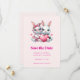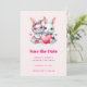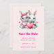Save the date card with an illustration featuring 2 white furry bunnies sharing a big red heart. The girl bunny is wearing a cute bow on her head and heart-shaped glasses. The boy bunny is wearing an adorable little suit with a tie.