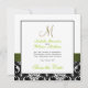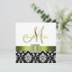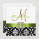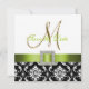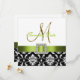 A elegância sofisticada é transmitida por este belo casamento Salve o design do Cartão de Data em um formato quadrado. Uma cor damasco floral a preto e branco serve de fundo para um efeito fotográfico do Dourado Metálico M Inicial e uma fita de satin verde e broche de diamante TODOS IMPRESSOS em um CARTÃO PLANO Salvar o Anúncio de Casamento de Data. Uma maneira perfeita de informar seus convidados sobre seu próximo casamento. Cor damasco temporária, porém clássica, com um design que permite personalizar a frente com seus nomes e a parte traseira é livre para adicionar o texto personalizado para salvar a data. O design é regulado para o monograma inicial "M". Para outras letras, cor de fita e fundo diferentes, entre em contato com o designer em luxuryweddinginvitations@gmail.com. Design de layout por Elke Clarke©. Gráficos licenciados. Além disso, escolha entre várias fontes e belos papéis para fazer seus convites de casamento PERFECT!