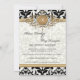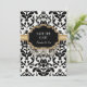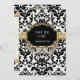 NOTA: Este é um convite impresso plano, não há camadas em relevo ou metal ou joias reais nele. É uma imagem projetada graficamente que parece bastante real, mas é plana. CARTÕES DE RESPOSTA: Use o tamanho menor de RSVP (8,9 cm x 12,7 cm), o tamanho maior não caberá. PALETA DE CORES: branco esbranquiçado, preto e dourado com aparência metálica. COLEÇÃO DE DESENHOS: Anúncio de Save the Date correspondente criado para combinar com o conjunto do casamento com o mesmo nome. Esta é uma Coleção de Convites de Casamento verdadeiramente elegante e sofisticada com um charme moderno e vintage formal! Mostrado aqui em branco cremoso sobre azul aqua, o convite tem uma aparência dimensional dramática e elegante. Para um toque final lindo, selecione o envelope de convite correspondente com o mesmo design. Esta é uma obra de arte projetada por Audrey Jeanne Roberts, criada a partir de padrões de damasco desgastados com aparência antiga, uma moldura linda com "jóias" em forma de diamante penduradas nela e sobreposta a uma fita com aparência dourada. Há cartões de resposta RSVP, convites de recepção, programa de casamento, instruções de direção, cartões de acomodação de hotel, selos, adesivos