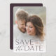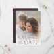 Anuncie sua data de casamento em estilo inesquecível com esses cartões salve a data elegantes e modernos, com uma foto vertical ou retraçada de cheio com "salve a data" sobreposta em letras ricas em ameixa ao longo da parte inferior. Seus nomes, data do casamento e local do casamento aparecem junto com a letra moderna. Personalize as costas com detalhes adicionais, como o seu site de casamento.