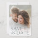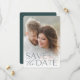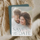 Anuncie sua data de casamento em estilo inesquecível com esses cartões salve a data elegantes e modernos, com uma foto vertical ou retrópica de cheio com "salve a data" sobreposta em letras verdes na floresta ao longo do fundo. Seus nomes, data do casamento e local do casamento aparecem junto com a letra moderna. Personalize as costas com detalhes adicionais, como o seu site de casamento.