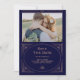 Esses elegantes cartões de aviso de casamento antecipado apresentam uma abordagem moderna do clássico art déco. Uma moldura geométrica com aparência de falso rose gold ornamentada decora um elegante fundo azul marinho escuro com sua foto pessoal favorita para um visual dramático e vintage de casamento.