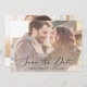 Esta delicada camada horizontal de fotos leves, para salvar o cartão de data é perfeito para um casamento moderno. A design romântica minimalista apresenta uma magnífica e elegante tipografia escura num fundo fotográfico.