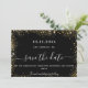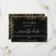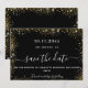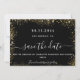 Um moderno e elegante Salve a Data para um casamento. Um fundo preto decorado com brilho de ouro falso. Personalize e adicione uma data e nomes. O texto: Salvar a Data é gravado com um script de estilo com letra de tendência grande.
