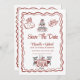 este convite italiano caprichoso de salvar a data do casamento apresenta, estilo desenhado à mão rabiscos e garranchos em vermelho. Uma borda de linha ondulada emoldura o convite italiano romântico. Um tema perfeito para o casal que vai para uma lua de mel italiana romântica após o casamento. Este design de salvar a data disponível apenas para impressão.