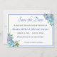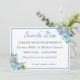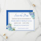 Cartão de Salve a Data floral azul safira com borda. Um lindo floral azul com acentos azuis safira. Perfeito para casamentos ou outras ocasiões especiais, como jantares de ensaio, chás de noiva ou celebrações de aniversário de casamento. – CUSTOMIZE FACILMENTE ESTE DESIGN usando os prompts do menu fácil da Zazzle. Outras peças de casamento da “Coleção Floral Azul Safira” disponíveis.