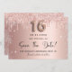 Uma garota e moda Salve o cartão de data para uma doce festa de aniversário 16, 16. Rosa dourado esmaecido fundo metálico decorado com ouro rosa, dourado e cinzas vítreas e poeira. Personalize e adicione uma data e um nome/texto. O texto: Salvar a Data é gravado com um script de estilo com letra de tendência grande com alternâncias. Número 16 com uma fonte no estilo do balão.