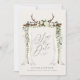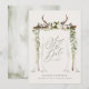 Convite de casamento com dossel rústico para salvar a data. Com bela folhagem em aquarela, flores brancas, galhadas, cortinas transparentes e escrita à mão. Este convite de casamento moderno certamente definirá o estilo para o seu casamento próximo.