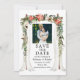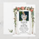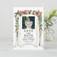 Dose de Foto Floral de Poinsettia Aquarela para Casamento Elegante Cartão de Save the Date inclui poinsettias vermelhas, rosas brancas, pinhas e folhagens botânicas. Foto do Casal.