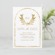 Incêndio aos seus convidados com este elegante casamento Salve a data com um belo galho de folhas de ouro. Basta adicionar os detalhes do seu evento neste modelo fácil de usar e enfeitar este cartão com a sua foto favorita para torná-lo um Cartão único para guardar a data.