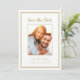 Este cartão de save-the-date com foto dourada e branca apresenta uma moldura moderna de borda dupla em torno da foto do noivado para uma apresentação limpa e elegante. A caligrafia em cor dourada adiciona um toque sofisticado em um fundo branco nítido, e a parte de trás do cartão é finalizada em dourado sólido para uma aparência coordenada. Este layout de retrato funciona lindamente com fotos em close-up ou de corpo inteiro. Personalize com os detalhes do seu casamento e sinta-se à vontade para entrar em contato para pedidos personalizados.