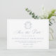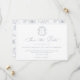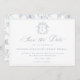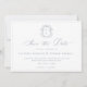Dusty Blue Monogramas Crest, casamento guarde a data. Vintage inspirou a crista do monograma barroco de arte de linha Regency-Era. Funcionalidades, uma elegante mistura de estilos de tipografia azul, elegante, de estilo design, e tipo ousado. Padrão de jardim do estilo Chinoiserie que suporta com detalhes de código QR.