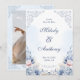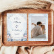 This romantic save the date design features soft dusty blue watercolor florals, delicate blush accents, and elegant vintage scrollwork. The front highlights the couple’s names with a timeless formal layout, while the back includes space for a favorite engagement photo and wedding website details. Its airy blue palette and refined botanical framing make it a beautiful choice for classic, garden, and romantic wedding celebrations. A lovely option for couples creating a coordinated blue wedding stationery suite with a soft and polished look.