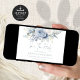 Florais Azuis Modernos, Código QR, Casamento Azul Escrevendo. Disponível digitalmente e impresso. Flores maravilhosas em azul e branco claros e um roteiro elegante em azul para Salvar a Data. O resto do texto que você pode personalizar facilmente com seus detalhes. Adicione seu código QR ao seu site de casamento na parte traseira ou exclua este e o texto na parte traseira, se não for necessário.