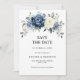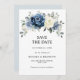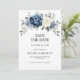 Casamento floral azul empoeirado salve o cartão de data com buquê elegante de azul marinho, azul real, branco, marfim de champanhe, rosa de cor esbranquiçada, botões de flor ranunculus e folhas de eucalipto verdes sábias e boquet elegante de aquarela. Entre em contato comigo para obter ajuda sobre a personalização ou se você precisar de outro produto com este design.
