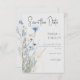 Este design do cartão de data save apresenta um belo buquê azul de cor d'água empoeirado de flores silvestres e flores de milho num fundo de papel branco texturizado. É parte da Suíte de Casamento Moderno de Farinhas Selvagens Azuis Dusty, criada pela Imprensa Simplesmente Farmhouse.