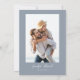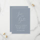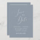 Moderno e mínimo salve o cartão de data com um roteiro elegante que diz "salve a data" em fundo azul empoeirado no meio com as breves informações do casamento. Você pode adicionar uma foto atrás.