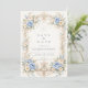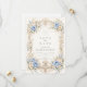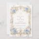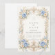 A graceful baroque design featuring soft dusty blue roses paired with ivory blossoms and delicate sage greenery. Ornate champagne scrollwork frames the composition in a refined, symmetrical silhouette inspired by classic European elegance. The cool blue palette against a warm ivory background creates a balanced, romantic atmosphere. Perfect for a quinceañera celebration that feels timeless, sophisticated, and beautifully detailed.