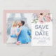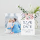 Esta foto empoeirada de rosa floral salva o cartão de data é perfeito para um casamento de primavera ou verão. A design floral romântica apresenta flores lilás roxas, cor-de-rosa-pincel e pêssego dispostas em um buquê pastel macio lindo. Personalize o cartão com sua foto de noivado, nomes, data de casamento e local.