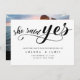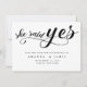 Negra minimalista moderna, disse que sim, o roteiro salve o cartão de data. Este cartão elegante apresenta um roteiro manuscrito a preto com coração vermelho agudo acima do texto 'ela disse sim' sobre fundo branco e detalhes do casamento e nomes escritos em letras maiúsculas a preto.Adicionar website e foto ao verso do cartão. Para editar este modelo, clique em personalizar mais.