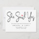 Negra minimalista moderna, disse que sim, o roteiro salve o cartão de data. Esse cartão elegante apresenta uma escrita manuscrita em preto com coração vermelho agudo acima do texto 'ela disse sim' sobre fundo branco, detalhes do casamento e nomes escritos em letras maiúsculas em preto. A parte traseira do cartão está preta. Para editar este modelo, clique em personalizar mais.