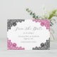 Elegant hot pink and black wedding save the date card featuring delicate floral lace.