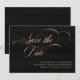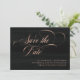 Este elegante cartão de salvar a data do casamento apresenta caligrafia moderna e espiralada em falso ouro rosa, sobre um fundo preto rico.
