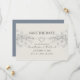 Elegante, moderno, rústico convite de casamento azul poeira para salvar a data com renda floral prateada falsa e coração de corda romântico.