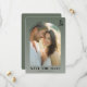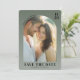 Este cartão de save the date de casamento apresenta um design caloroso e íntimo com uma moldura de foto oval que mostra dois indivíduos em estreita proximidade. O fundo verde oliva suave contrasta lindamente com os tons bege e branco das roupas deles, criando uma atmosfera serena e convidativa. A tipografia serifada elegante destaca detalhes importantes, enquanto as fontes sans-serif limpas adicionam um toque moderno ao layout. Perfeito para anunciar o seu dia especial, este cartão combina charme tradicional com estilo contemporâneo, estabelecendo o tom para uma celebração memorável.