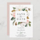 Esta elegante magnólia branca, para salvar a data é perfeita para um casamento clássico moderno. O design floral suave apresenta coloração aquosa, cor-de-rosa pincelada, impressionantes flores brancas de magnólia e algodão, com ouro e folhas verdes, num arranjo luxuoso.