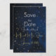 Essas elegantes economize as datas da noite são perfeitas para qualquer casamento noturno elegante. Bela cor azul escura em todo o fundo com luzes luminosas e vagalumes brilhando nas folhas das árvores e ao fundo. Certifique-se de procurar nossos itens correspondentes vendidos aqui: https://www.zazzle.com/store/heritagematters/products?cg=196873255086485540