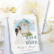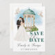 Anuncie seu dia especial com nosso Elegante Salve o cartão de Data. Apresentando uma ilustração romântica da Noiva e do Groom em um local pitoresco com um charmoso gazebo enfeitiçado com flores e duas pombas graciosas, esta design dá o tom perfeito para o seu casamento. O verso mostra um fundo de ouro luxuoso com pombas adicionais, simbolizando amor e unidade. Personalize com seus nomes e data de casamento para torná-lo exclusivamente seu. Perfeito para casais que buscam uma maneira sofisticada e memorável de compartilhar suas grandes notícias